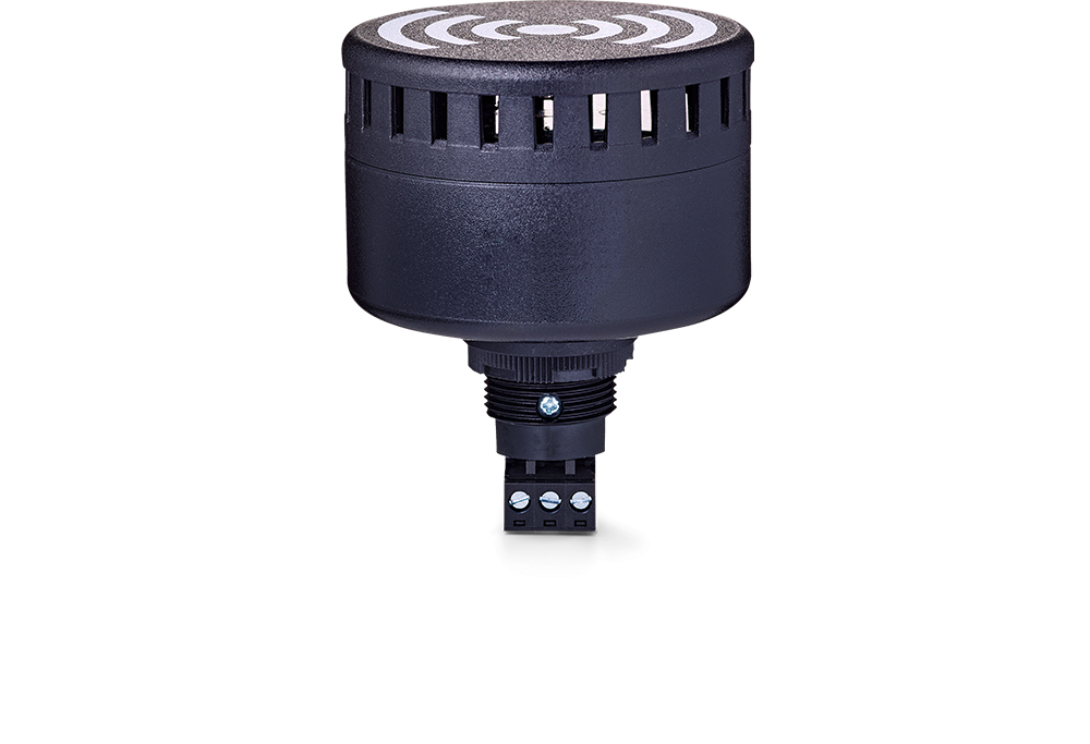 Auer Signal ESG electronic buzzer for M22 panel mounting, 65mm diameter. 105dB sound output, IP65 rated. Compact panel-mount buzzer for control panel audible alarms.