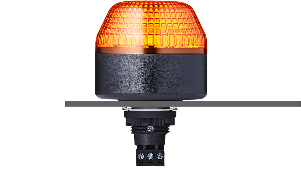 Auer Signal ICL LED strobe beacon for M22 panel mounting, 65mm diameter. High-visibility strobe flash pattern, 230VAC. IP65 rated for control panel use.