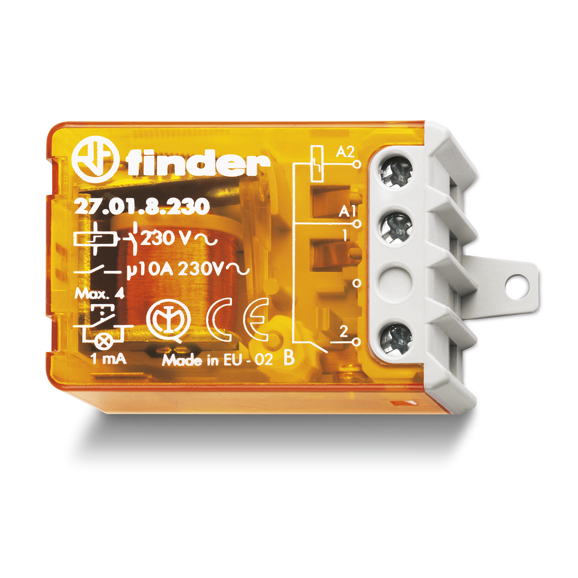 Step relays, Clamp terminal, Single pole switching – 1 NO, 10 A, AC coil, 230 V, operating from 184 to 253 V, resistance 6500 Ω, consumption 17.5 mA, ambient temperature from -40 to +40 °C