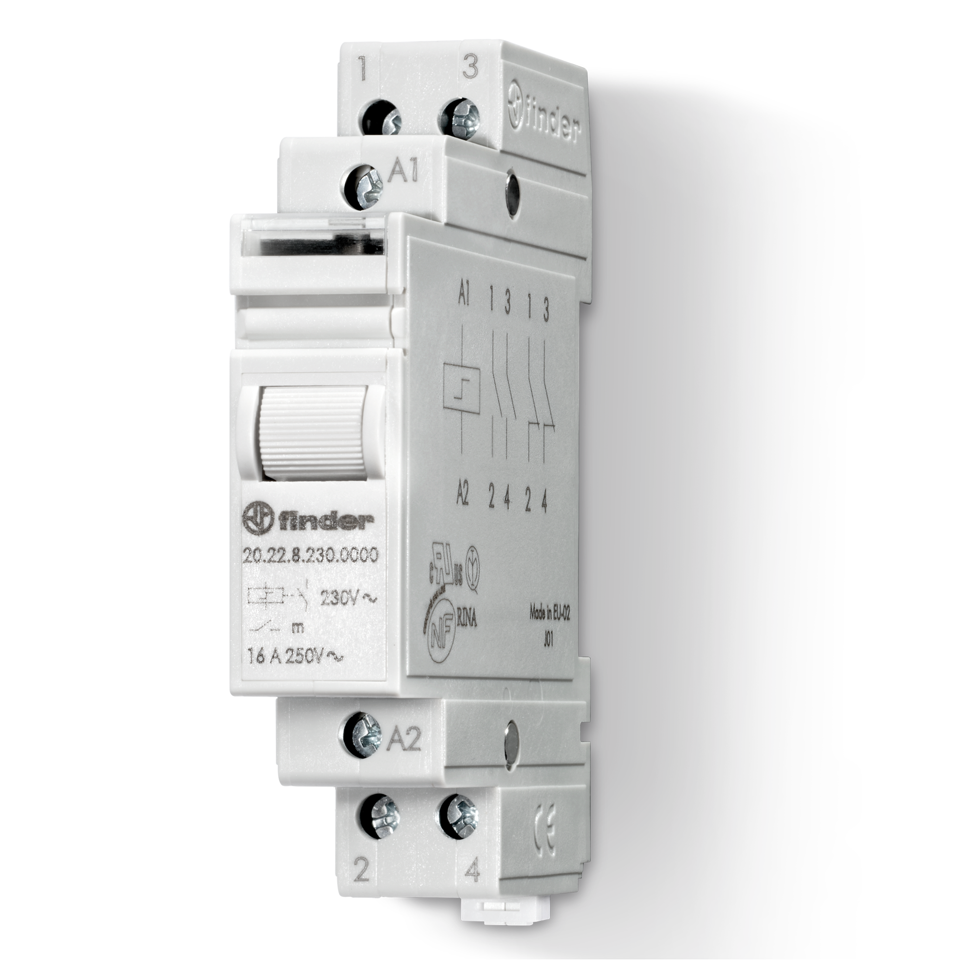 – Modular step relay, 16A, with 2 NO single-pole contacts, 2-step. For direct mounting on 35mm rail (EN 60715). One module width 17.4 mm, Test button and mechanical indicator, AC or DC coil.