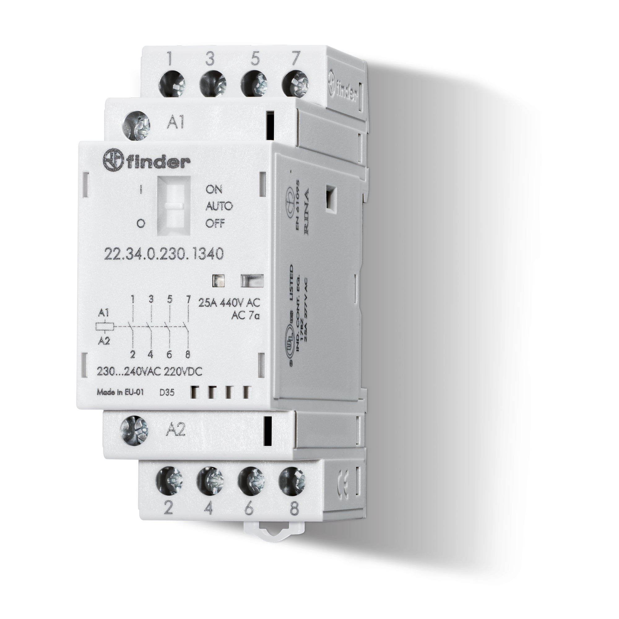 – Modular contactor 25 A – 4 contacts, 35mm width and a NO contact gap ≥ 3 mm, double break. Type 22.34 complies with EN 61095: 2009.