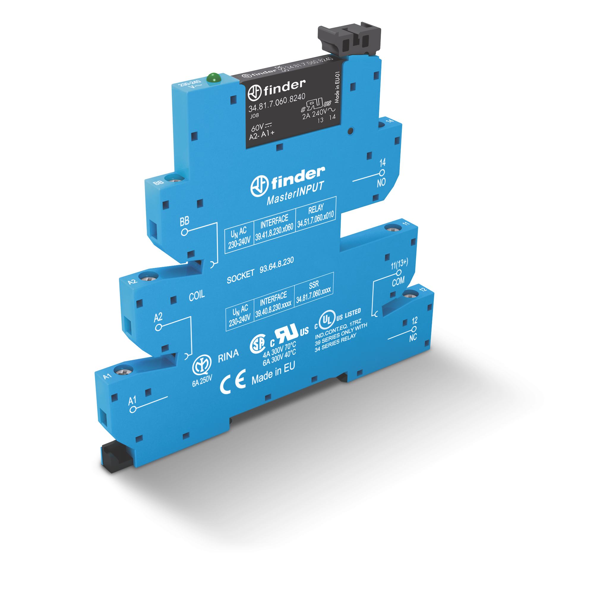 – MasterINPUT SSR is a Relay Interface Modules with screw terminals – solid state relay 0.1, 2 or 6 A, input supply 24 – 125 V AC/DC and 230 V AC, 1 contact, 35 mm rail (EN 60715) mounting. 6.2 mm wide, designed for interfacing with PLC systems. Version available with Push-in terminals (Type 39.70).