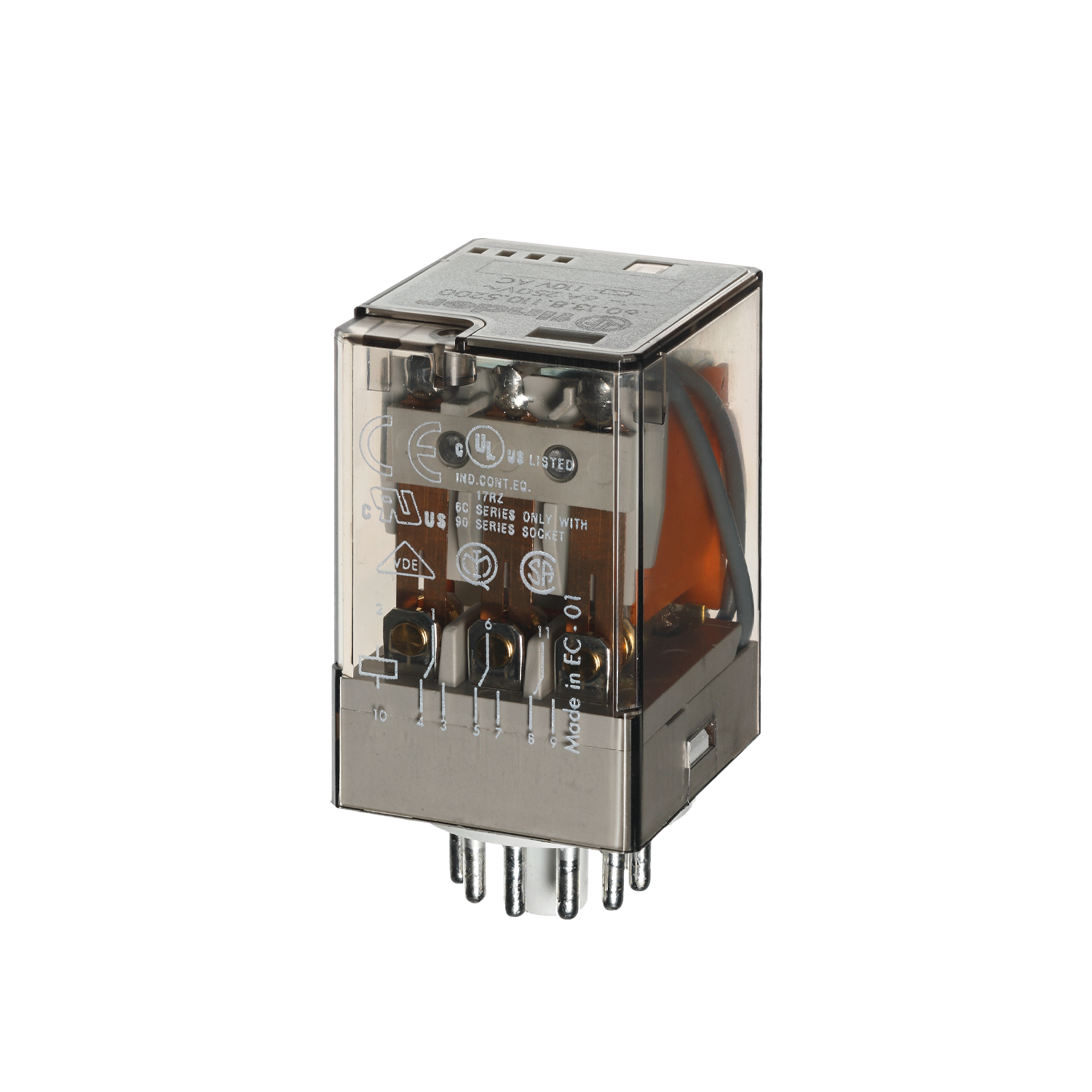 – General purpose industrial relay, 3 pole 10 A contacts, 11 pin plug-in. Equipped with lockable test button and mechanical indicator (preferred version). Available version with bifurcated contacts for low level switching: type 60.13-52xx, 3 pole, 6A, 11 pin plug-in.