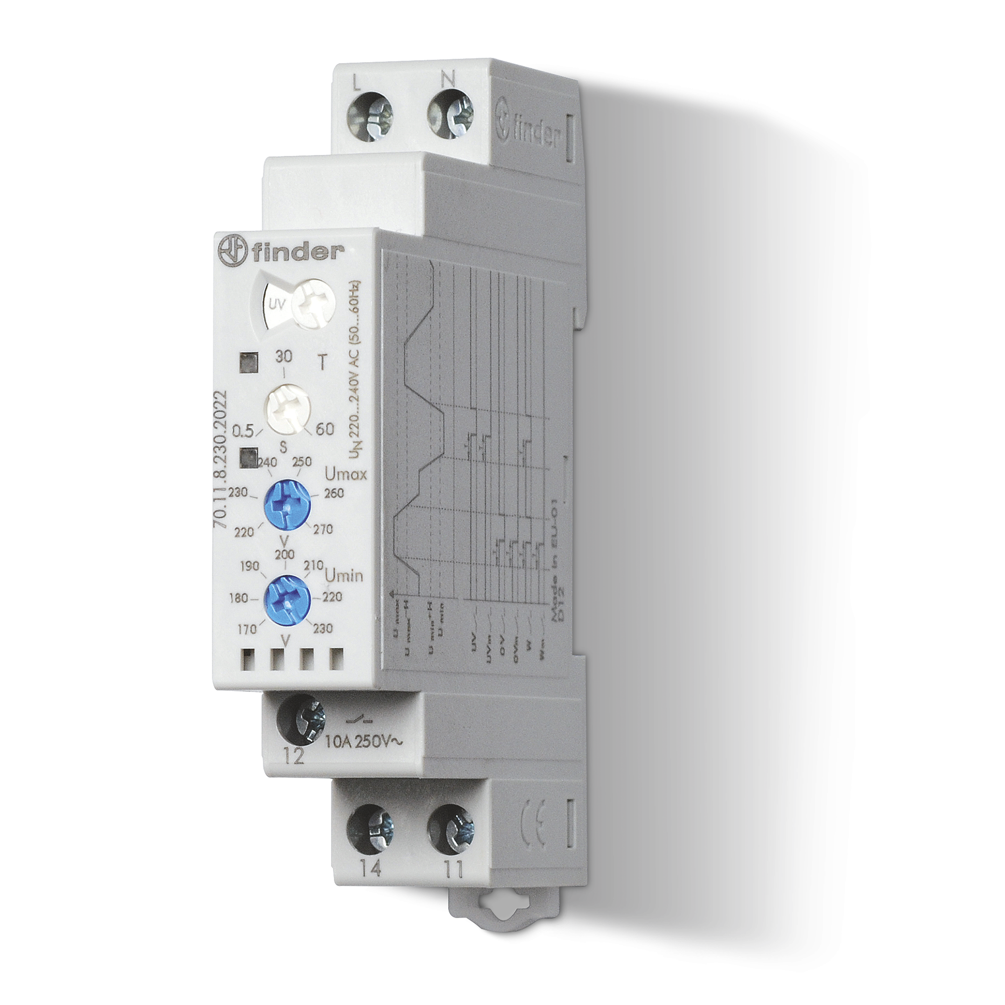 Finder VOLTAGE MONITORING RELAY, 1 PHASE UNDER+OVER+WINDOW, 170-270VAC,